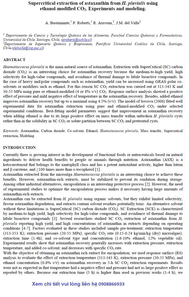 Nghiên cứu chiết xuất astaxanthin từ H. pluvialis bằng công nghệ CO2 siêu tới hạn